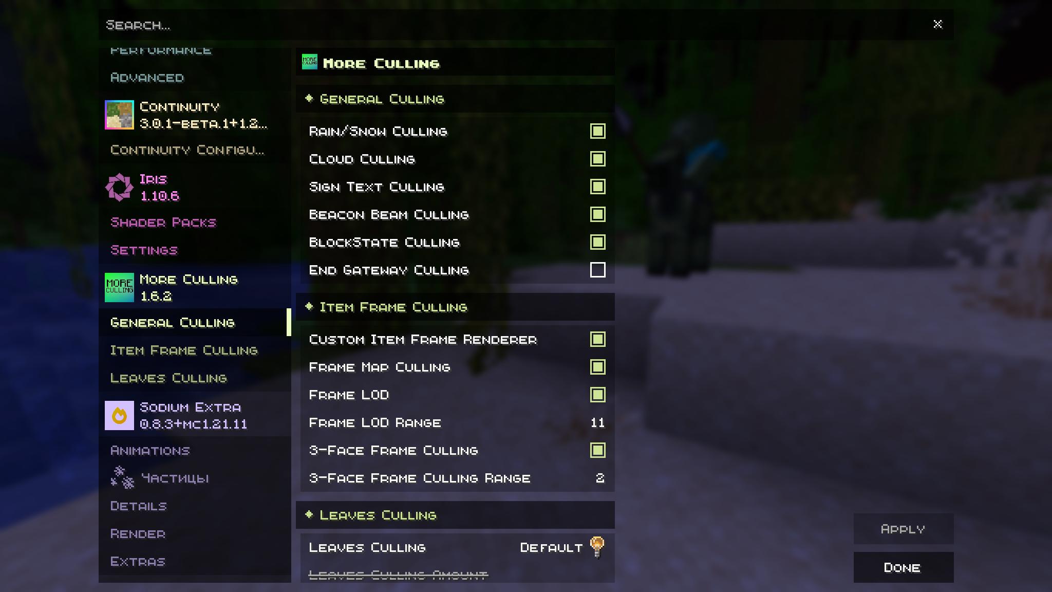 * **Sodium Extra** — Extra toggles for Sodium: animations, weather, particles — full control.
